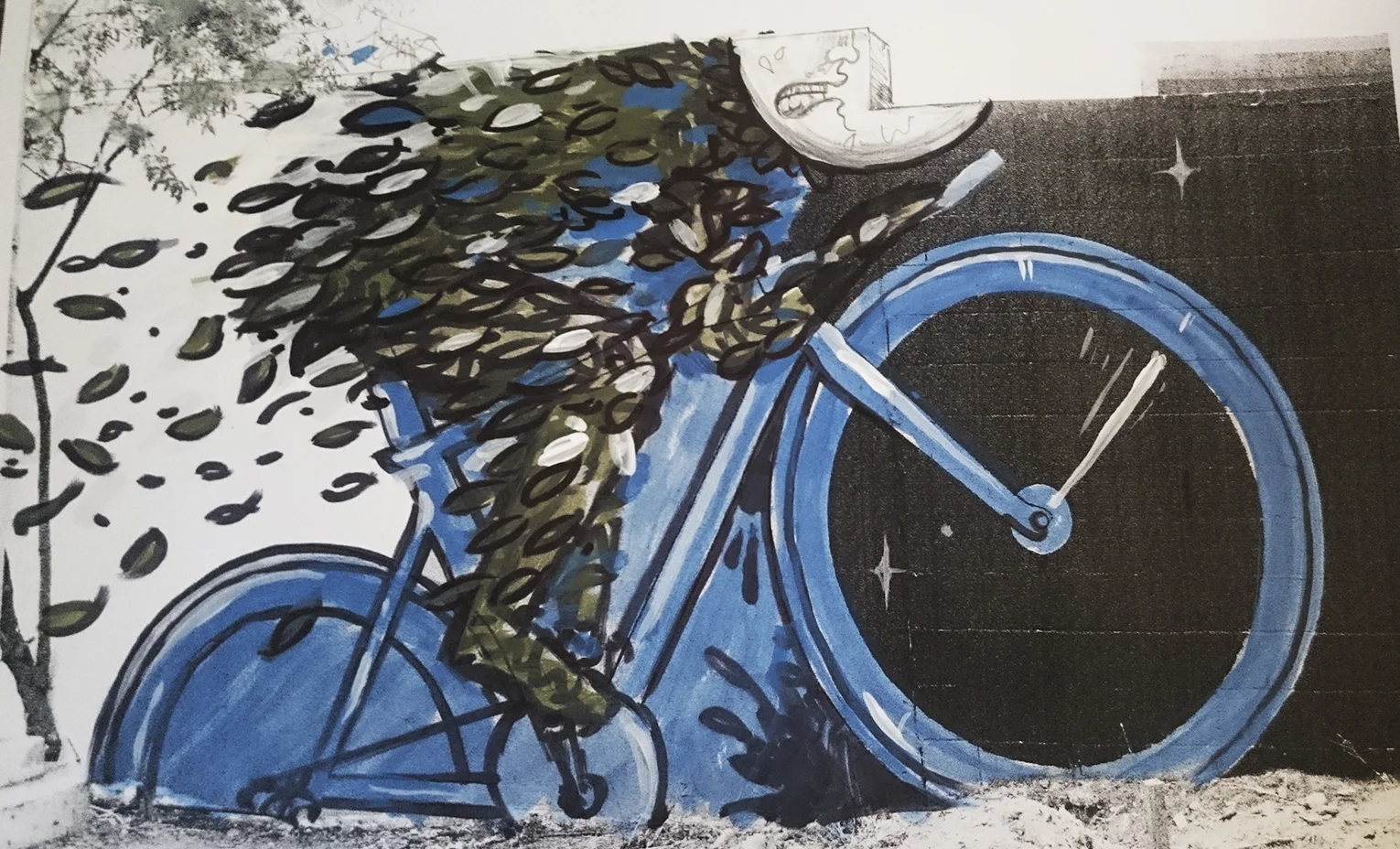 I recently got hired to paint few murals and signs at Spoke Bicycle Cafe on LA River bike path in Frogtown. Spoke is a cafe and a bike shop. What a fun project! Tommii Lim jumped in and painted one section of the front wall. I did the wind/leaf man hustling hard on his road bike on the left and art directed this project. This mural almost feels like its coming out of the left folliage and on to the bike path. I also did some hand painted signage and painted the cool container doors that when opened, let the bikers and joggers ride or run into the large space inside of spoke.